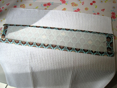 1 strip per towel of fabric. mine were 16 inches wide, so i cut my strips 17 inches by 4 inches.
