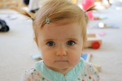 sadie sans pigtails (pulled out of course), insisting for the fourteenth time that i sing her old mcdonald had a farm. she loves that little finger puppet glove thingy.