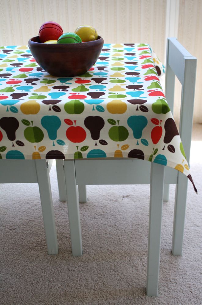 I hit the remnant jackpot the other week at Joann’s! I found a ton of cute prints (usually those are rare), and bonus-the bin was 50% off. YAHOOOOOO! (Yes, I get that excited about fabric) One of my finds was this awesome fruit print-a whole yard for about $3. Niiice. I decided that Sadie’s table needed a tablecloth. It’s really taken me this long to make one! I’ve been on the hunt for the perfect fabric.