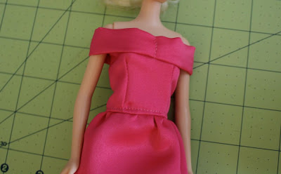 Then sew them down, sew on a pretty button or bling bling-and there you are! A cute, off the shoulder ball gown for Barbie®!