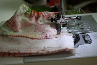 Then on the other edge, lay your elastic down about 1/2 inch from the edge, stitch and back stitch a few times.