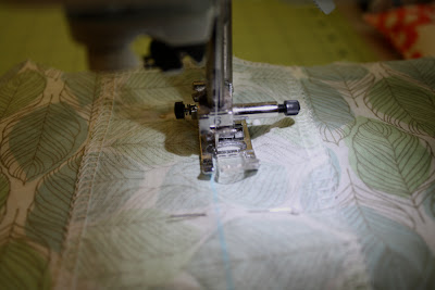 Then, starting at the top, sew down one side, about 1/8″ from the line..then over a few stitches at the bottom, and start going back up the other side, but a little bit further from the line. STOP about halfway up and cut your threads..we’ll be adding the elastic now!