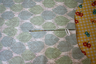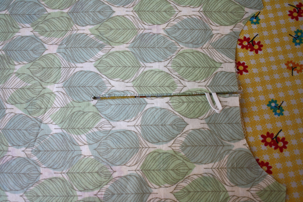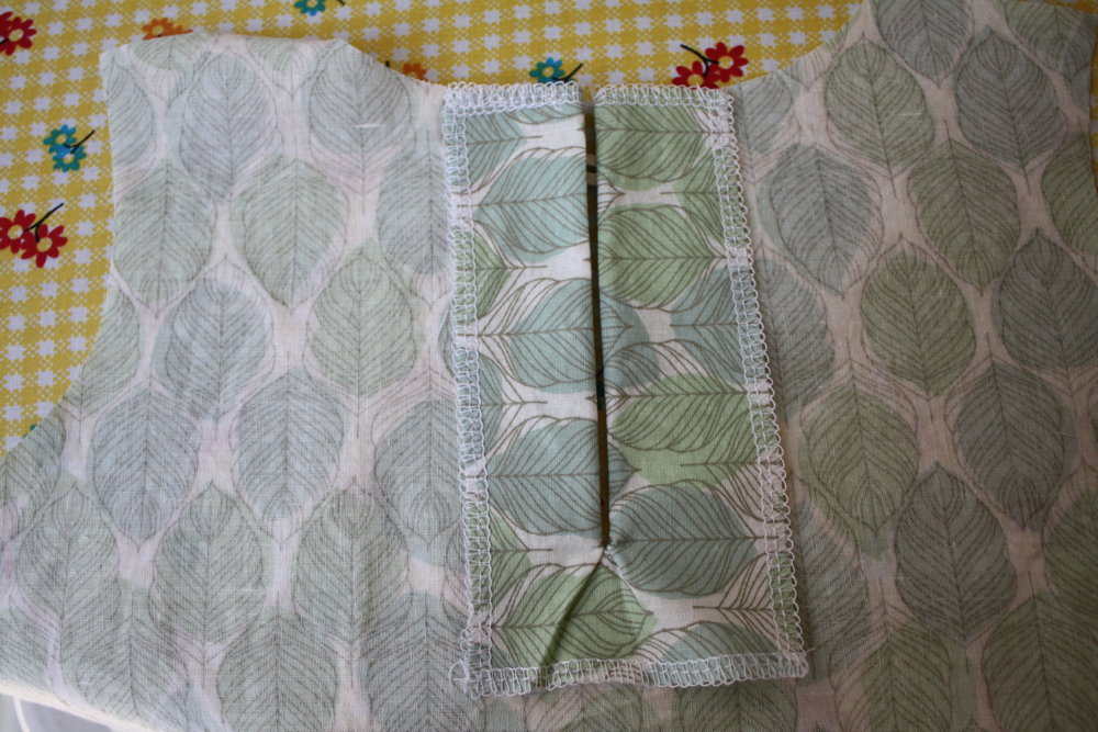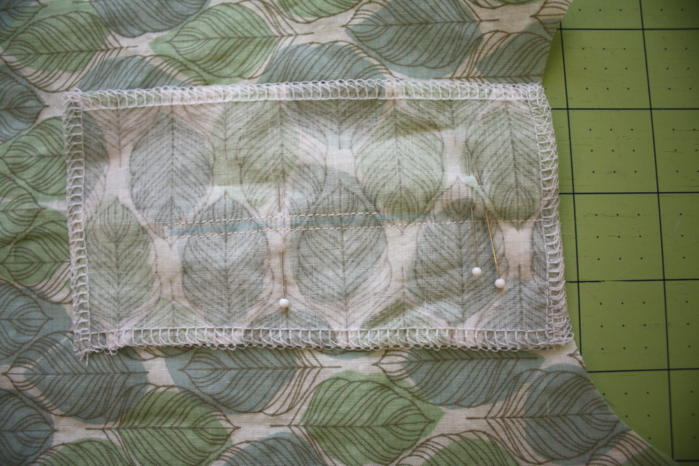 In the center of your back piece, place it right side down like so, and pin…then using a ruler and tailor’s chalk (or invisible ink, or a regular ol pen since you won’t see it), draw a line down the center, stopping about 1.5″ from the bottom of your fabric piece.