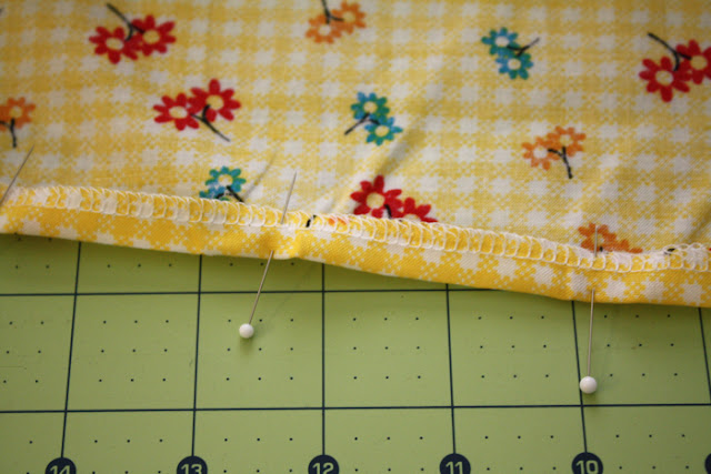 then fold over 1/2 inch and pin. On the curved parts it may be a tad tricky-but it doesn’t have to be pretty-you’re not going to see it! (unless you regularly turn your ironing board upside down)