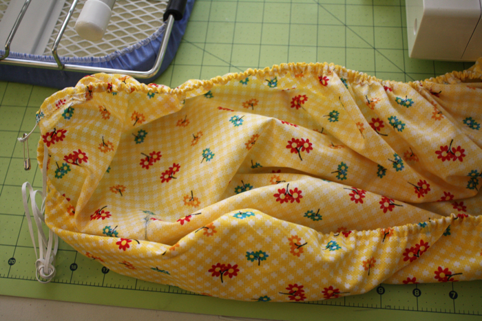 pull both ends of elastic tight, and adjust as needed. Ties your two ends securely together- pull it off the ironing board, and sew the opening closed. Tada!