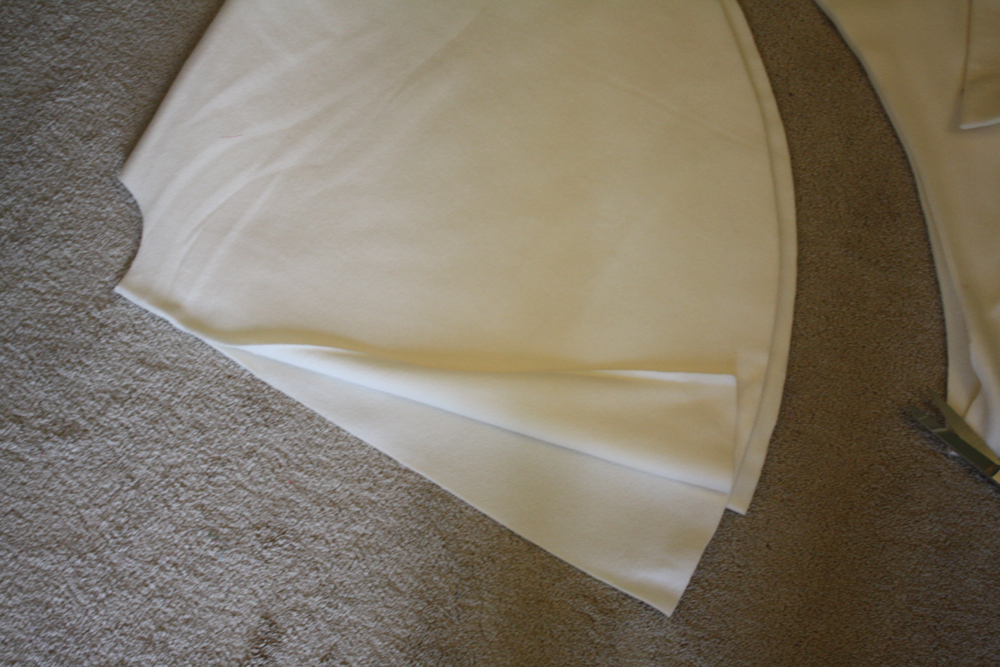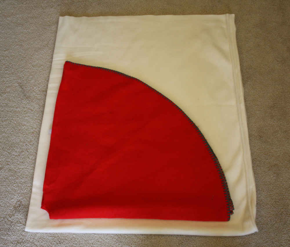 First, fold your fabric piece in half, then half again. I used a tree skirt I already had for a pattern-I would recommend that. I made mine a little larger than the one I had since I knew it was kind of small.
