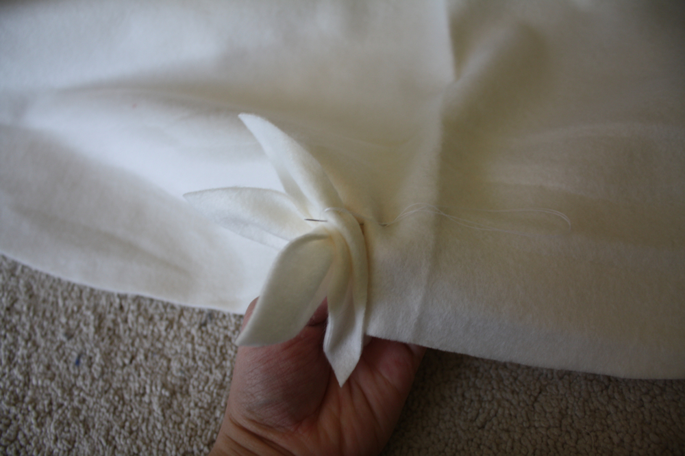 Then sew the whole flower to the edge of your circle. I laid all of my petals out so I knew where to place them…roughly a few inches apart.