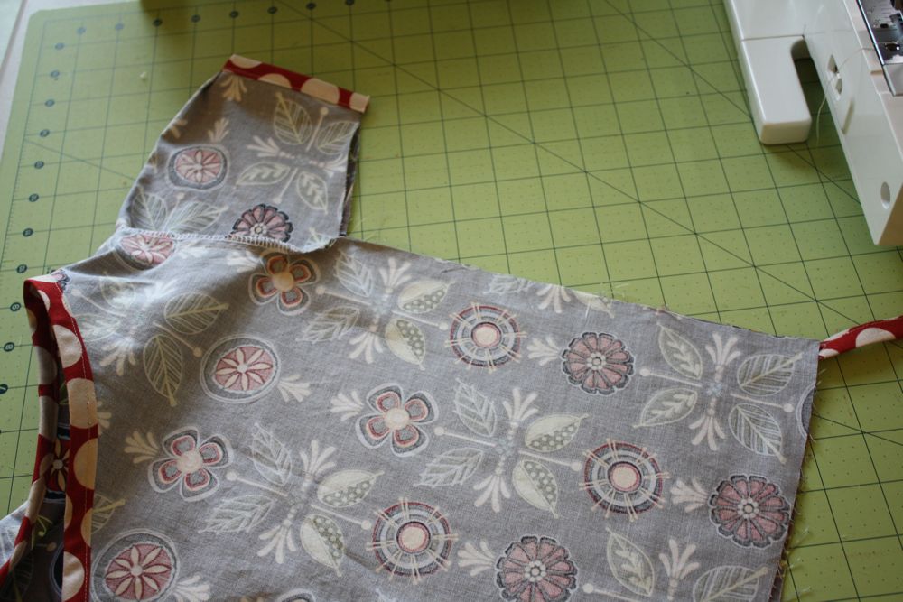 *Just wanted to mention – to finish off the end of the ties: Before you sew all the way to the end of the tie, you can turn your bias tape inside out and sew across the end, then flip it back around and it will be a finished, squared end. This only takes a little time and makes a very clean end. The pinking is cute, though!