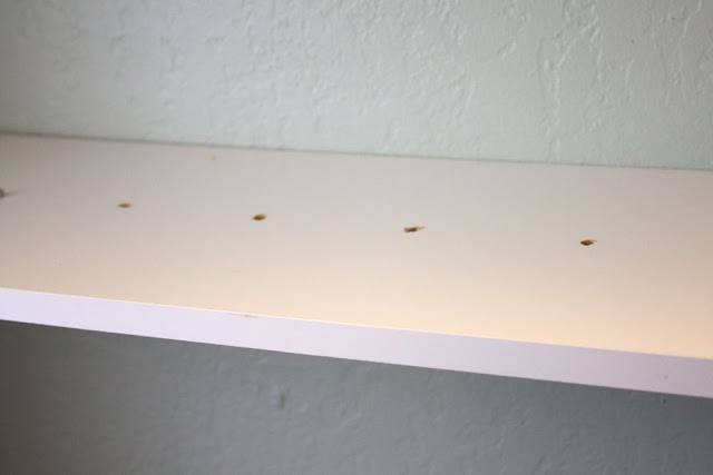 So I measured and marked on my shelf where I wanted my hubby to drill holes. He then did so.