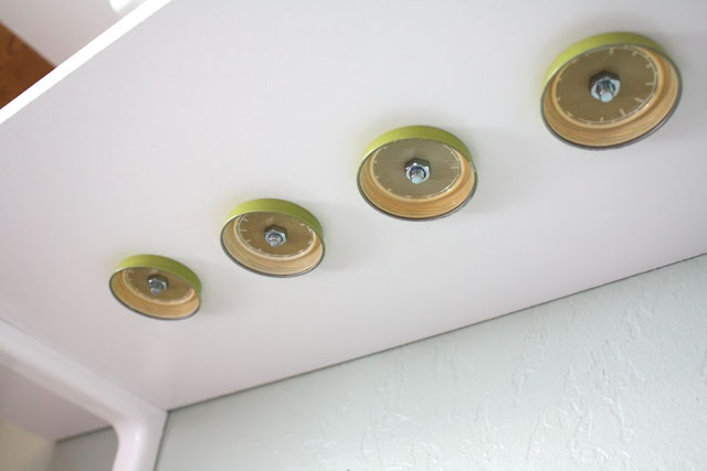 I then spray painted the lids-concentrating on the rims since the tops would be hidden. Then I used the nuts and bolts to attach the lids to the shelf.
