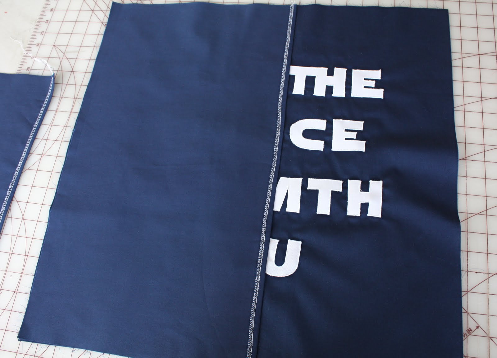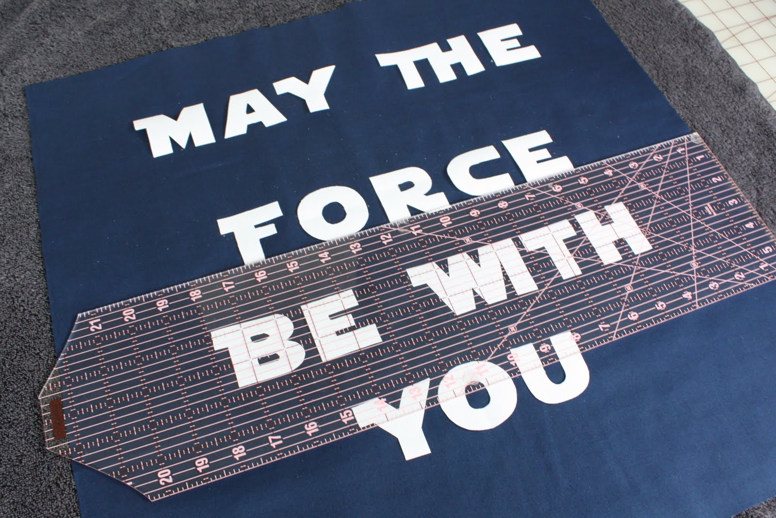 Using my clear ruler, I laid out my lettering so it would be centered. Once it was all in place, I ironed it down. I put a towel under it so I could iron on my table, since it wouldn’t all fit on an ironing board. Â