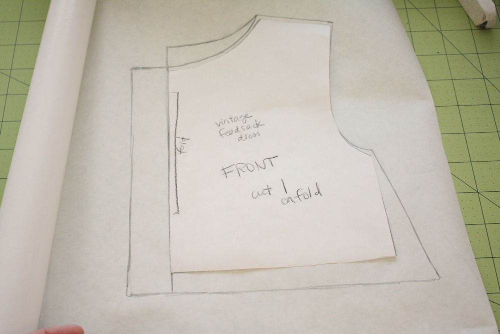 I also drew in the back neckline, and added space for my buttons in front by adding another inch to the fold line. Normally I would trace another separate pattern but I am almost out of freezer paper so I didn’t have enough! I would suggest tracing another one though.