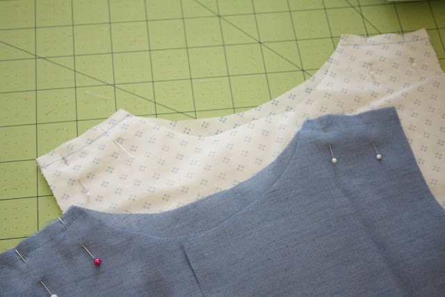 Then press the shoulder seams open, and lay the pieces like so, RST (right sides together). Pin around the neckline and down the front seams.