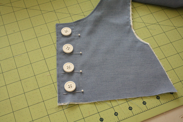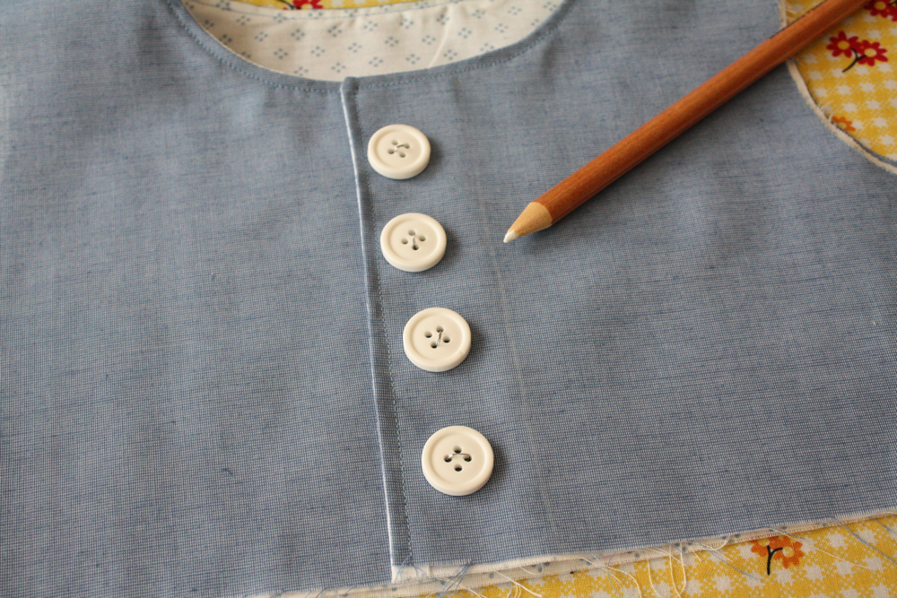 Next, overlap your front bodice pieces, and lay your buttons out where you’d like them, then draw a line (please use a ruler! unlike me) and then sew a row of stitching (or two) along that line.