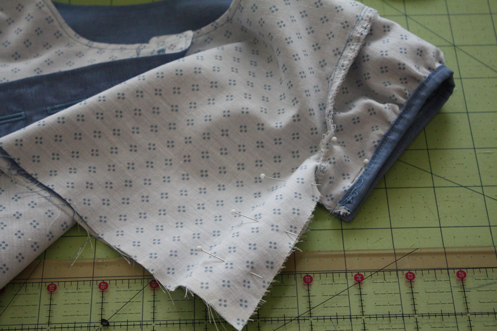 Next gather the sleeve top to fit the arm hole and pin it right sides together.