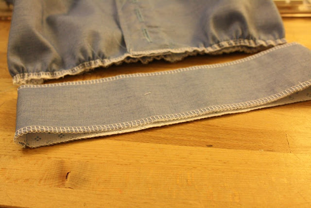Starting on one side of the button placket, sew a gathering stitch along the bottom of the