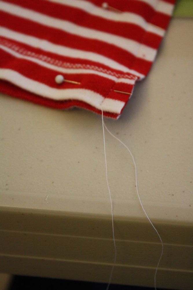 Then pin and sew the sides of the shirt together. Leave a tail at the bottom of the shirt if you don’t like to back stitch over knit…