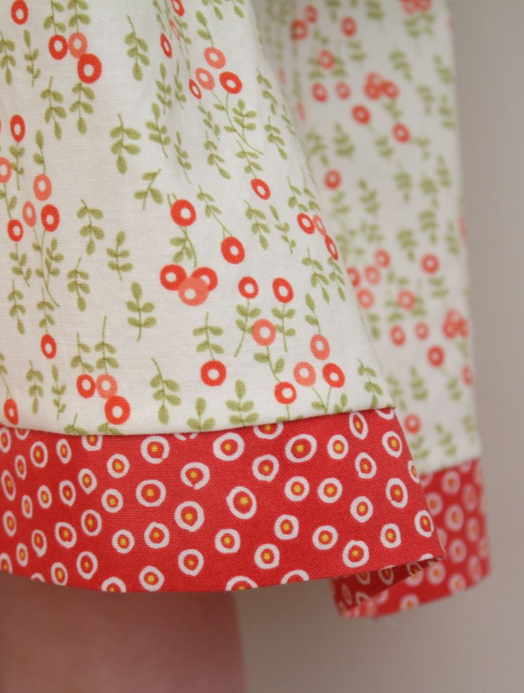 My sewing yesterday started off with shorts and morphed into this dress-a Leah tunic, lengthened, and with a band added around the bottom. Also with some cute coordinating fabric. I’ve mainly been making dresses this week because they’re all Sadie will wear lately. Kind of annoying cause she won’t wear the cute tops I’ve made her, but fun also cause-hey, more dresses are always fun to make!