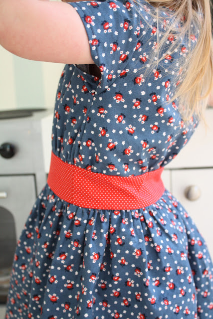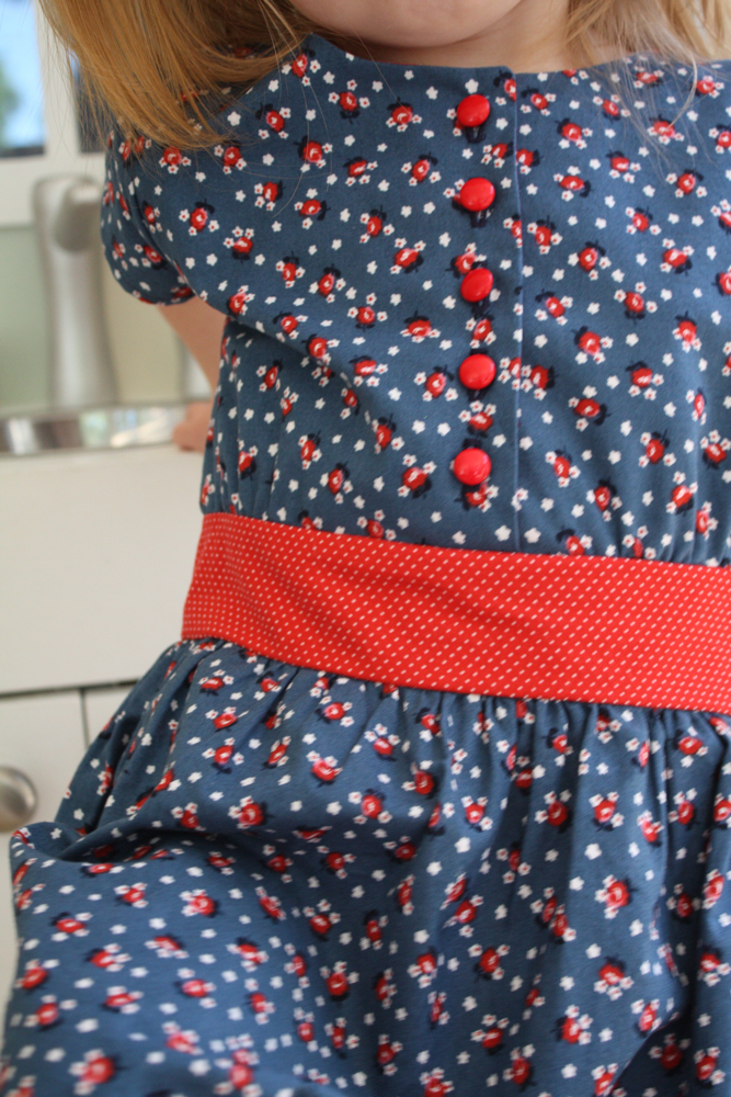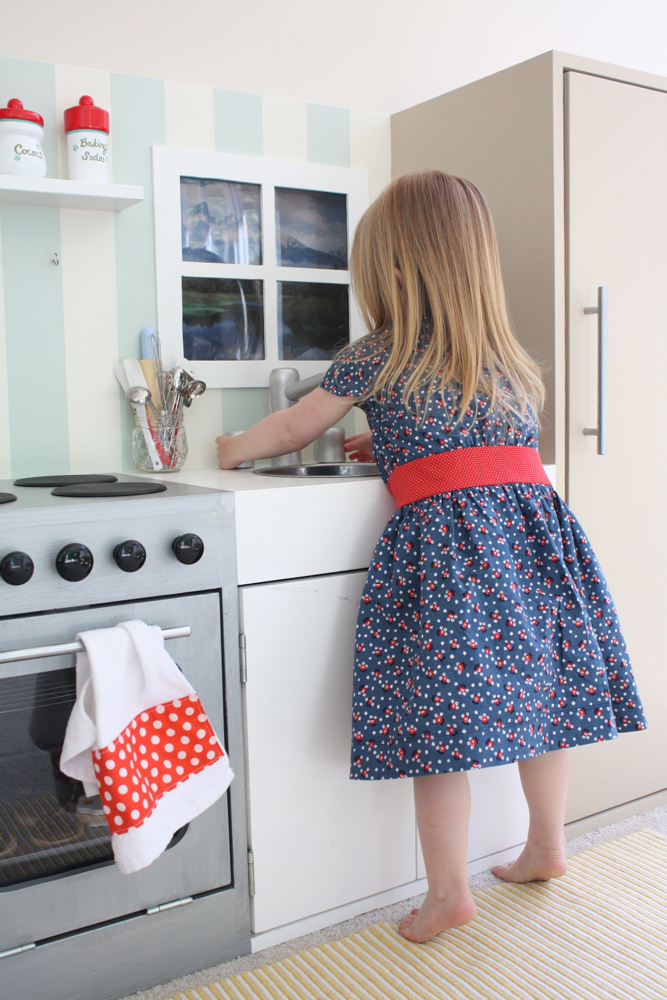 It reminded me of a 50’s housewife dress, so I bribed got Sadie to pose playing in her play kitchen for me!