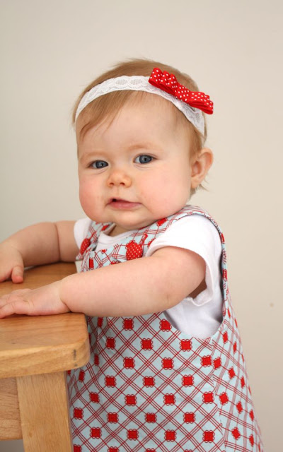 I love the aqua and red fabric! The pintucks are great too! I want to kiss Charlotte’s cheeks, she’s so adorable!