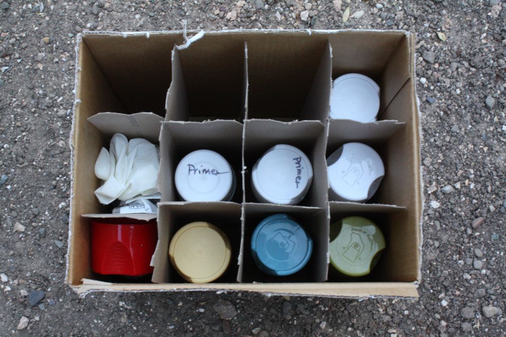 Here’s a fun tip for storing your spray paint-I use a wine box. No I didn’t drink that much wine just to get the cool box. 😉 I don’t drink any alcohol actually… but when I bought Rory’s root beer, they put it in this box for me to take home. It just so happens that the little slots for bottles are the perfect size for spray paint cans. (and space for some gloves-a fingertip saver!)