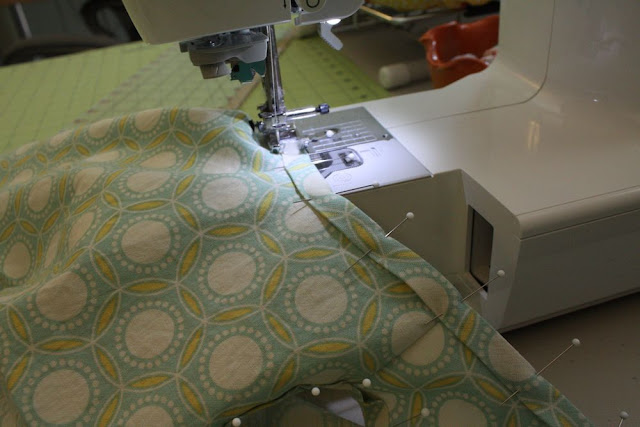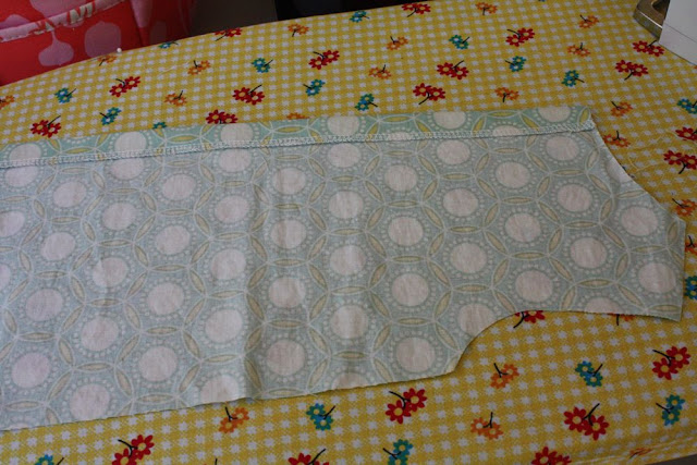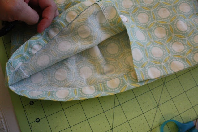 Hem the bottom by folding and pressing up 1/4″, then another 1/2-3/4″, and sewing that down.