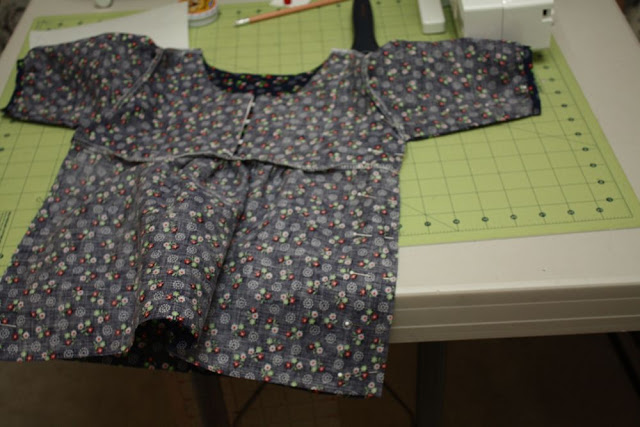 Then pin the front bodice shoulders and back shoulder seams RST and sew them together. Finish seam with serger, zig zag stitch, or pinking shears, whatever your choice of weapon may be.