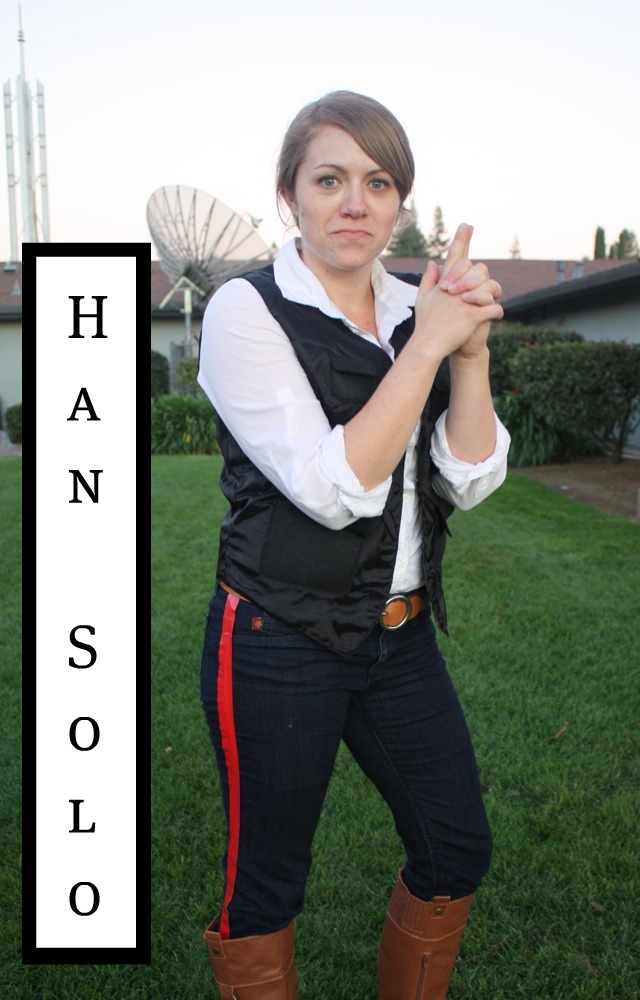 I loved my costume this year, Han Solo is one of my favorite movie characters of all time! I got most of my outfit at the thrift store-vest, shirt, and belt at least. Boots from Old Navy, pants from my sis, red duct tape from Target. You can’t tell very much, but I sewed on felt pockets to the vest, which I turned inside out. (it has some green plaid wool on the outside, lol!)ย I’ll have to get a better pic, cause it looked cool! I didn’t get a blaster or holster because there was a “no weapons” allowed rule, which we broke because Rory had his light saber. I also heard (the morning of) that cross-dressing was also not allowed, so we totally broke two rules. Such a rebel! I guess I had the Han Solo attitude. (though I was prepared to say I was Henrietta Solo, Han Solo’s twin sister)