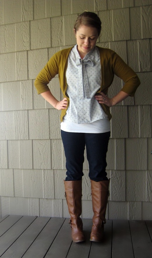 Today’s outfit is kind of like yesterday’s-with a color swap. Grey cardigan swapped for a grey top…and green top swapped for a green cardi. I made the top with this tutorial-it was a quick sew and fun to make! It is a bit boxy but I didn’t feel like taking in the back at all. I’ll just wear it with a cardi most of the time I’m sure.