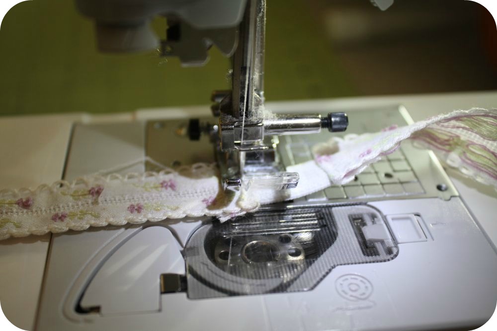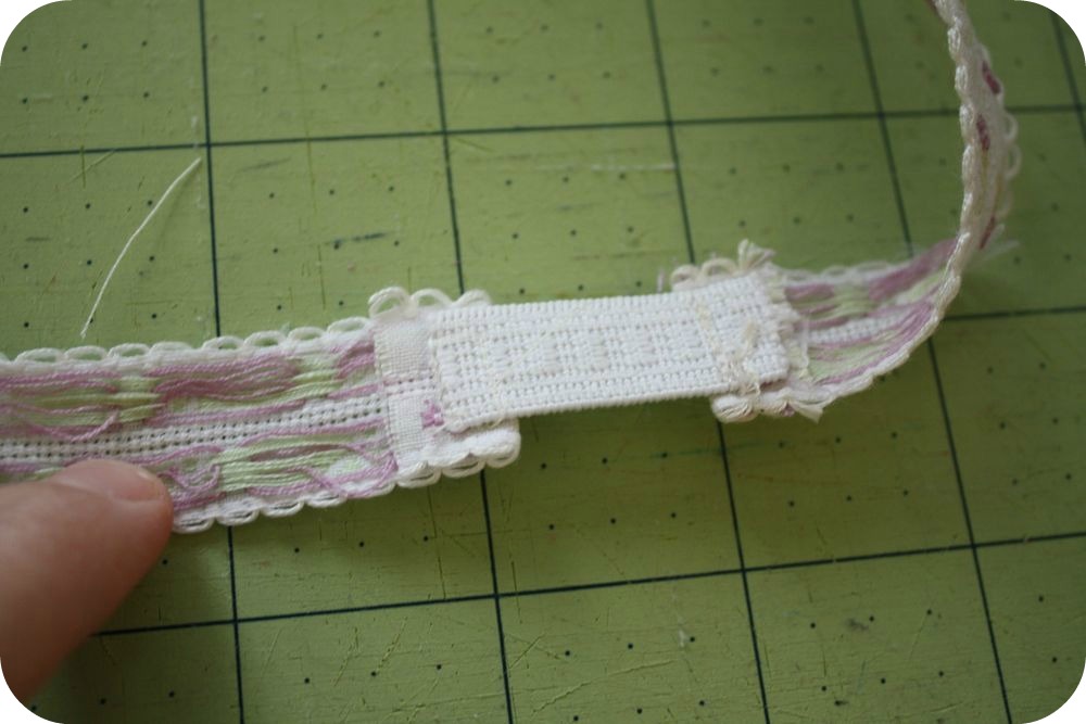 Then I folded each raw edge of the trim under 1/2″ , then sewed the elastic on top of the fold, on the wrong side of the trim. That seemed to do the trick with sizing…but it’s probably best to cut a slightly longer piece of elastic, sew one side on, then try it on and adjust before sewing on the other side.