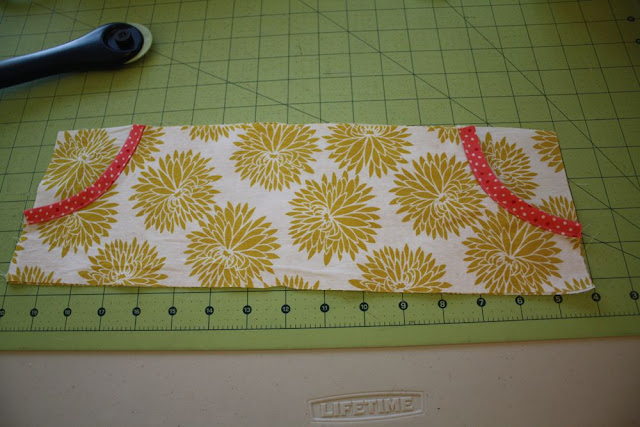 Then on the pocket piece, pin and sew bias tape to the pocket edge.