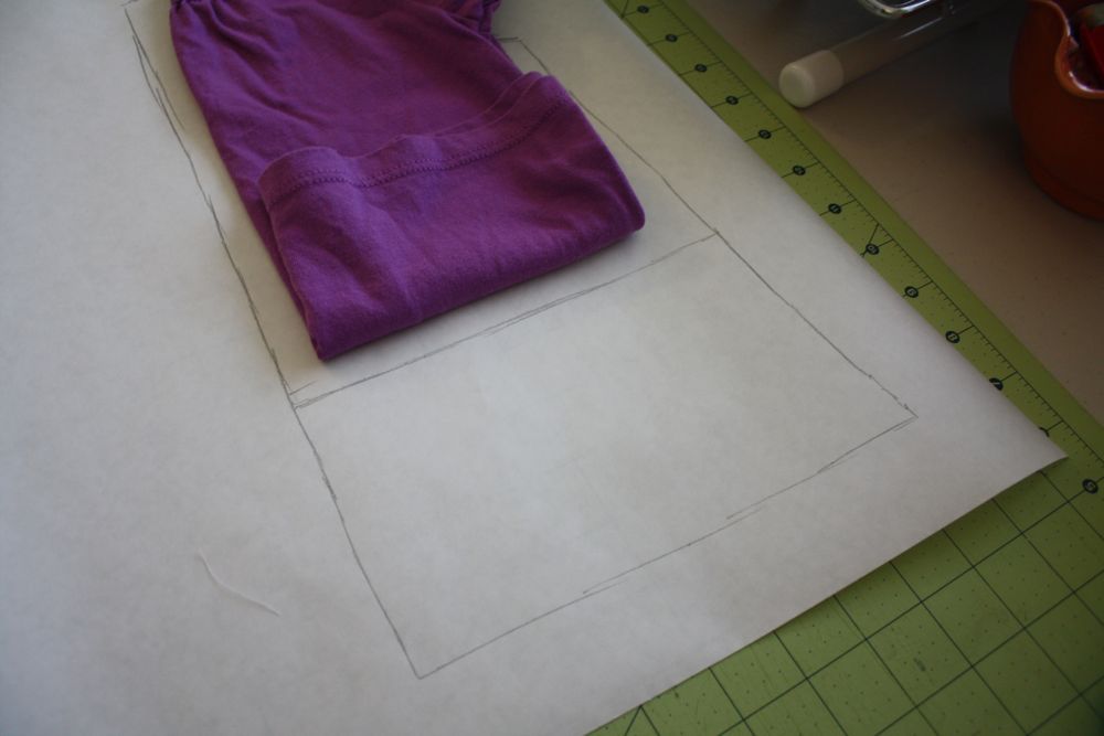 Where I wanted the elastic waist to hit, I folded up the shirt and drew a line. Then I drew the bottom portion, the side at a bit of an A-line. Make sure to add 5/8″ seam allowance to the two pieces where they match up and an extra inch or so on the bottom for hemming.
