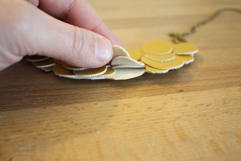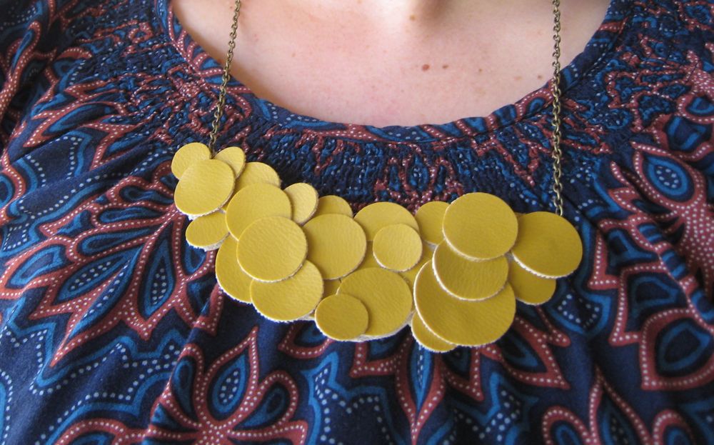 “Bib” necklaces are all the rage, are they not? Yeah I’m kind of behind the times, I’m sure. Anywho-I found some of this vinyl stuff in the remnant bin at Joann’s-in a lovely shade of mustard…so of course it hopped into the cart and came home with me, destined to become a necklace.