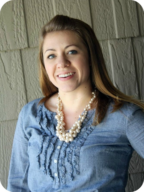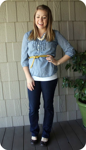 I loved pairing this casual chambray shirt with some fancy dancy pearls! I was headed to a baby shower, so I wanted to look comfortable but a little dressy. Hopefully it worked. I never know if my outfits do. :}
