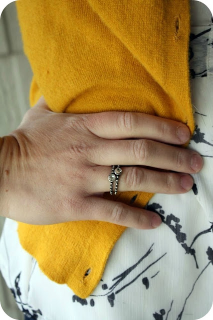 I guess I really like the white/black print, mustard yellow cardi, and red accent-outfit. (see last post for another version) Also the sloppy hair look.