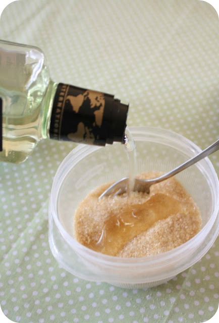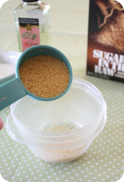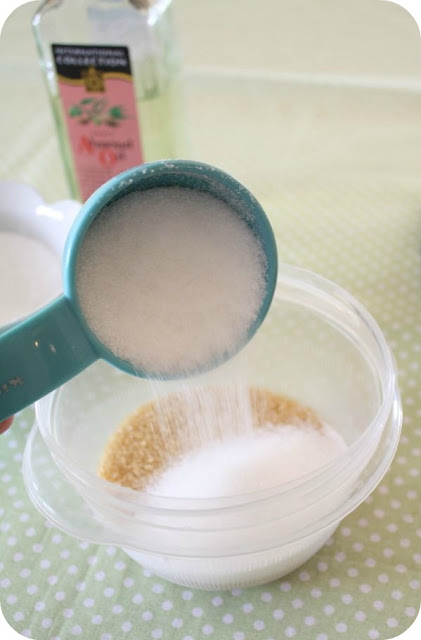 I made these for Christmas gifts and even sold a few this year. I use plain ole table sugar, extra light olive oil and a little bit of vitamin E oil. You can find it with the other vitamin supplements. It’s really good for your skin and it also has some preservative qualities. The E oil is a bit pricey, but I’ve made several batches and haven’t even used half the bottle.