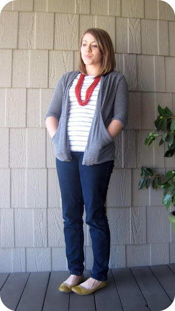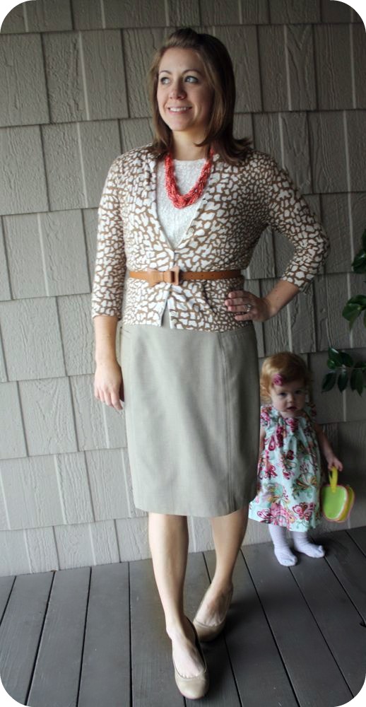I love your outfits…all of them! My favourite one is the one with the animal print cardigan and the coral necklace. How sweet is your little girl lurking in the background. Thanks for being a constant inspiration.