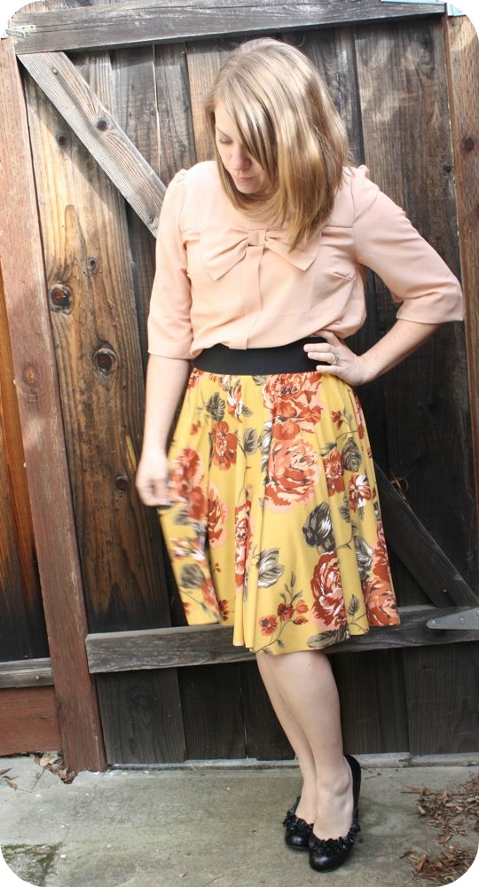 I made this circle skirt way back around Christmas time, but had the darndest time finding a top to match. The colors are really specific in the print. But I finally found a top to match! Hooray!