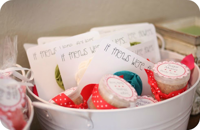 I made some felt flower pins for the mommas-with this tutorial and this one too. I attached them to some quick cards I made that said “If friends were flowers, I’d pick you!” I didn’t get any better pics, sorry. I also made some “Sugar Mama” body scrub-which I’ll be posting about soon!