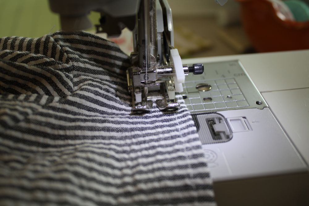 Then I sewed around the edge, creating a casing, inset about 1/4″ to create a little ruffly effect. Sew all the way around the outside all the way, but the inside stitches, leave a opening for the elastic.