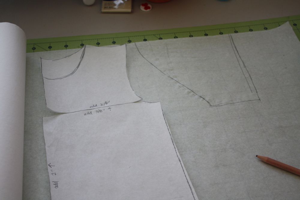 Make sure to add notes to add seam allowance to the top of the shirt panel and the bottom of the bodice. Add 2″ to the fold of the panel.