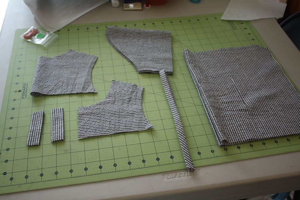 Cut out one back bodice piece on the fold, and one of the front bodice pieces on the fold, then cut in half on the fold. Cut out two sleeves on the fold, and 2 shirt panels on the fold, make sure to add seam allowances.