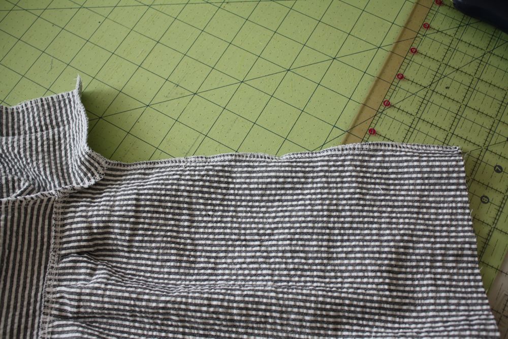 Then I decided my shirt wasn’t long enough, and cut two pieces of fabric on the bias, 2 inches wide, and the length of the bottom of the shirt panel, plus a little for seam allowance.
