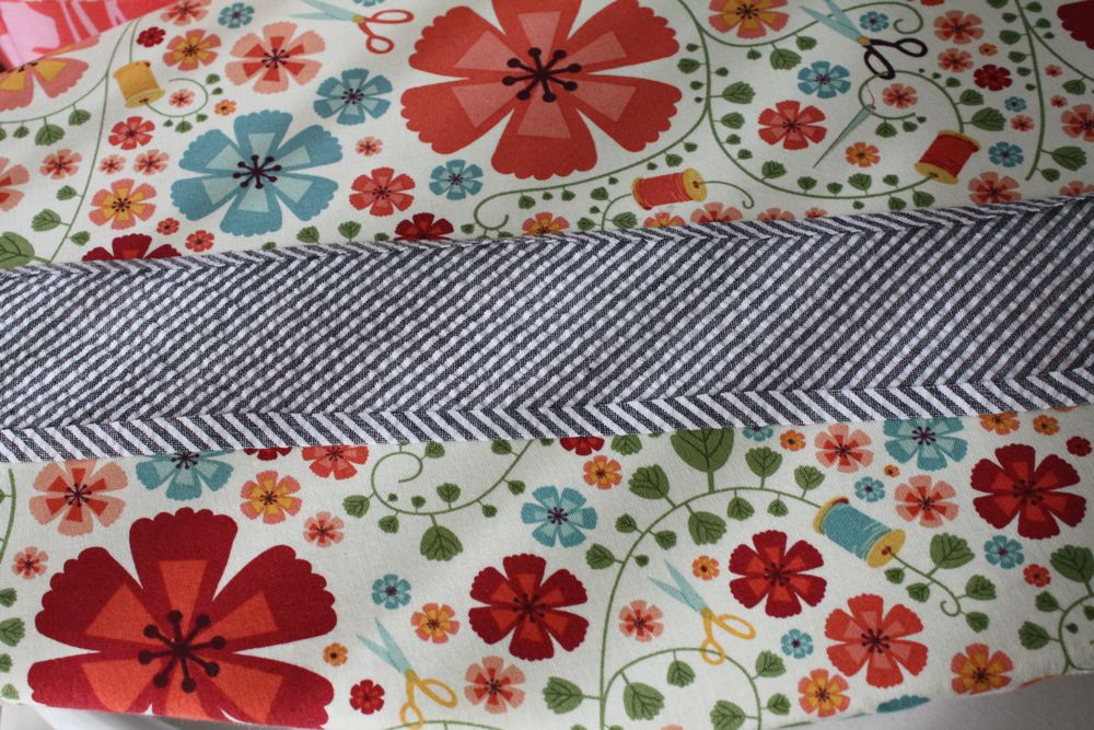 Then I cut and made a piece of bias tape for the neckline, and two pieces of fabric 2.5″x the width of the front bodice. I ironed in the edges of those pieces 1/4″, then in half (just like in this tutorial)