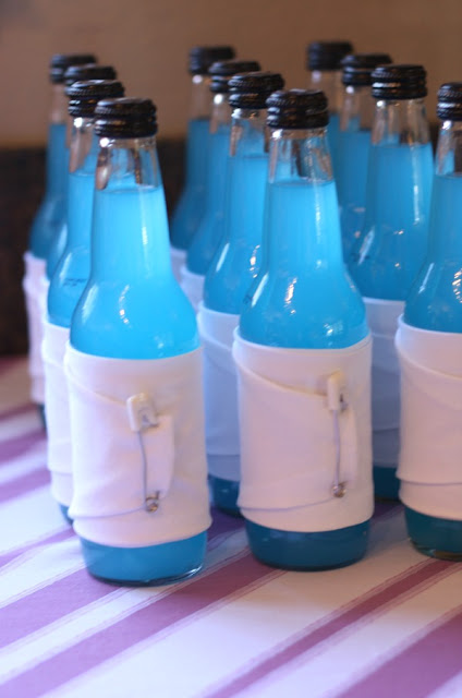 I bought some sodas in the color scheme (well would’ve loved to have a lighter blue but they were all out. sad face.) and wrapped some fabric around them, then pinned with some diaper pins.
