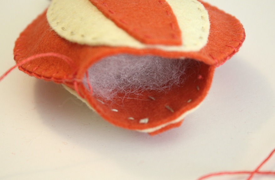 When you get to the top again, stop your stitches and fill with a bit of poly fil. Not too much, just enough to give it some shape.
