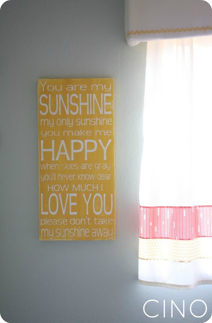 I love the sweet song lyrics, and the yellow and white color combo fit in perfectly with the nursery colors. Her signs are very well made (painted letters, not vinyl), and perfectly distressed.ย I was very impressed with the quality. She has a ton of color options and lots of different sayings and such to choose from!