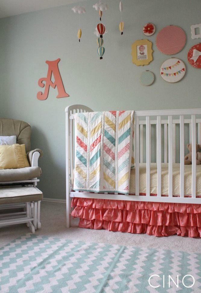 Love the color palette and hot air balloon theme! The coral is so fun for a girl and not the ordinary bubble gum pink you see so much of in girls nursery stuff. Super cute! The quilt is amazing.