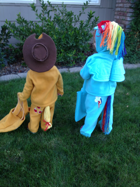 Happy Halloween from a bunch of ponies! Rainbow Dash and Applejack to be more specific. We had our church trunk or treat party last Saturday so the girls got to wear their costumes-they loved it! Surprisingly a lot of people knew who they were ( I should have known the parents of little girls would, but an 11 year old brother of a little girl knew their names, lol! so cute)