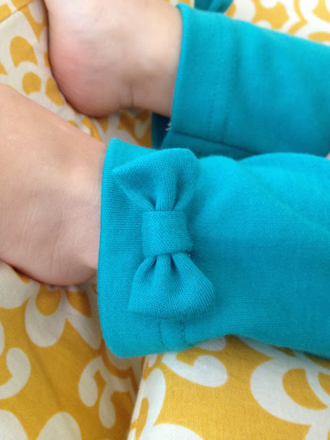 I whipped up another pair of leggings using a thrifted sweater for the baby…and they ended up fitting Charlotte. haha….I have sizing issues sometimes, can you tell? Nobody’s perfect. Anyways…I added some quick little bows at the ankles for a touch of cuteness. I love adding little details like that…I just have to remember to do it. ๐